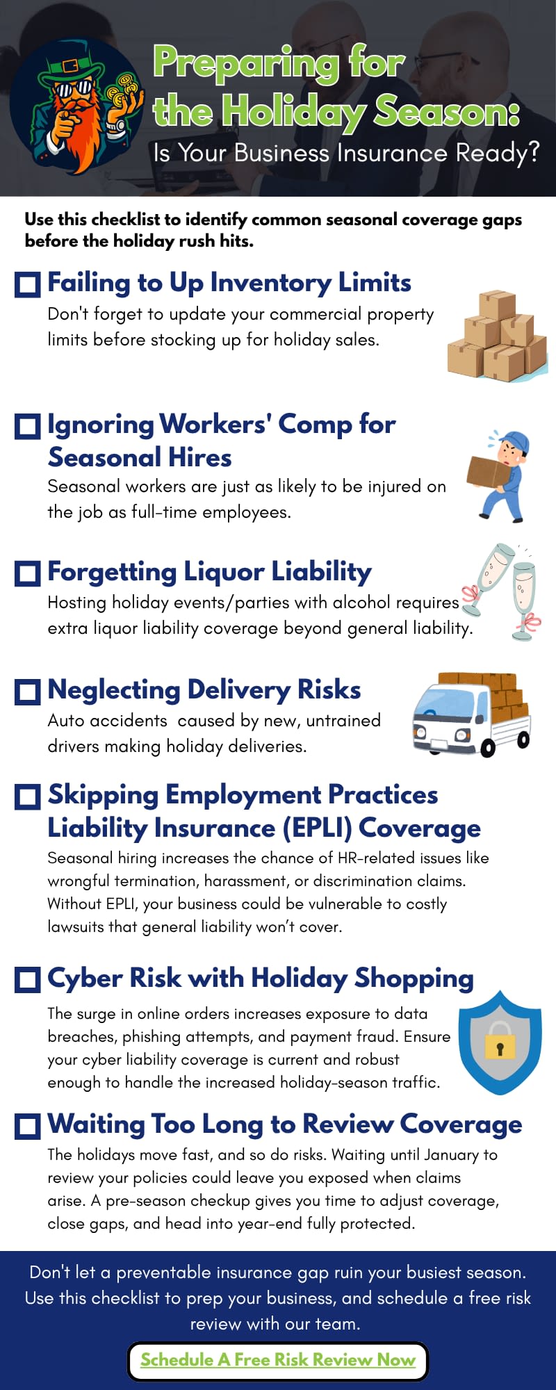 The holiday season brings a spike in sales and in risks. From seasonal hires and theft to weather damage and cyber threats, many business owners overlook key exposures during the busiest time of year. Our free infographic + checklist breaks down 7 overlooked insurance risks that could cost you big this season,